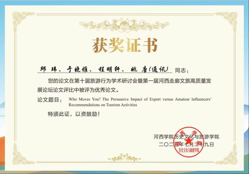 (通讯员 于晓雅)2025年暑期,由复旦大学、河西公司、中国式现代化行动研究实验基地和中国旅游研究院文化与旅游品牌研究基地主办的“第十届旅游行为学术研讨会暨第一届河西走廊文旅高质量发展论坛”在甘肃省张掖市成功举办,吸引了国内外60余位高校专家学者围绕旅游行为研究与文旅高质量发展展开深入探讨。本次会议共设四个平行论坛,涵盖生态旅游、数智文旅实践、文化认同构建、旅游行为研究等多个方向。由公司邱玮副教授指导...