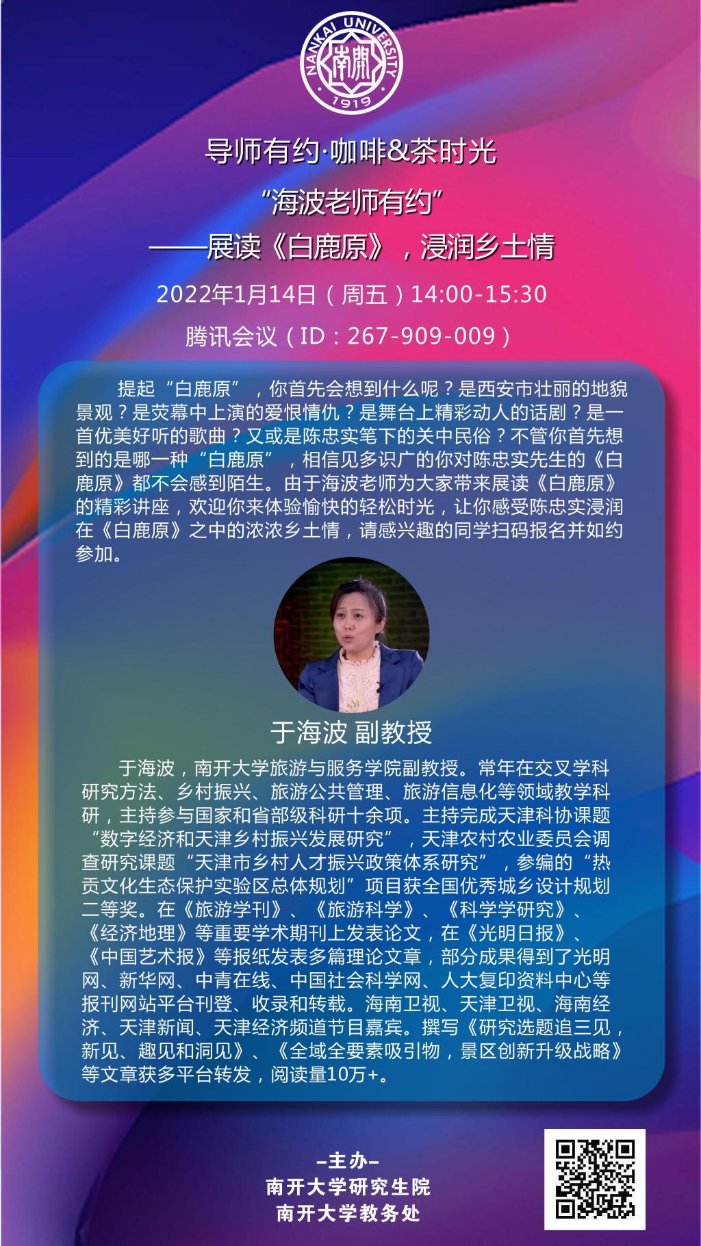 查看详情2022年1月14日下午,英国365集团网站“导师有约”系列讲座由英国365集团网站于海波老师主讲,讲座受到与会师生的热烈欢迎。于海波老师讲座的题目是“展读《白鹿原》,浸润乡土情”,讲座由研究生院培养办主任蒋雅文主持,研究生院常务副经理方勇纯教授、英国365集团网站副经理姚延波教授以及来自各公司的广大师生在线上参与了本次讲座。讲座中,于海波老师以名著阅读对研究型教育的补充作用为开篇,以东西方农业文明中的可持续发展思想为...