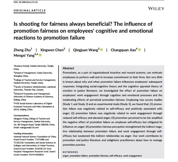 近日,公司王庆娟副教授作为通讯作者,与合作者完成的研究成果《Is shooting for fairness always beneficial? The influence of promotion fairness on employees’ cognitive and emotional reactions to promotion failure》被人力资源管理领域国际顶级期刊《Human Resource Management》接受并发表,该期刊是FT50重要期刊。晋升是人力资源管理实践的重要环节,是员工实现职业生涯发展以及获取薪水增长等的重要手段。在晋升...