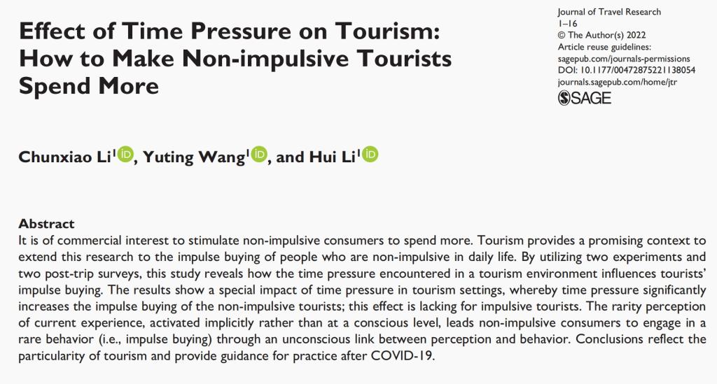查看详情近日,由公司李春晓老师作为第一作者、王玉婷同学作为通讯作者,与李辉老师共同完成的研究成果《Effect of time pressure on tourism: How to make non-impulsive tourists spend more》被旅游管理学科国际三大顶尖期刊之一的《Journal of Travel Research》接受并发表。该成果是王玉婷同学在旅游者消费领域完成的系列成果之一,前两篇成果《To buy or not to buy? The effect of time scarcity and travel experience on tour...