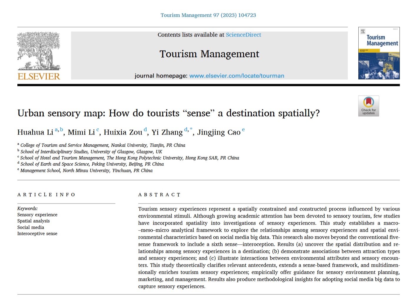 查看详情近日,公司博士生李婳婳作为第一作者与校外合作者共同完成的研究成果《Urban sensory map: How do tourists “sense” a destination spatially?》被旅游管理学科国际三大顶尖期刊之一的《Tourism Management》接收并发表。此论文是该博士生在旅游感官领域的系列成果之一,该研究以微博内容作为数据源,通过构建宏观-中观-微观空间分析框架,探讨目的地游客感官体验在全局与局部空间范围内的集聚性与分布性规律,揭示不同空间里...