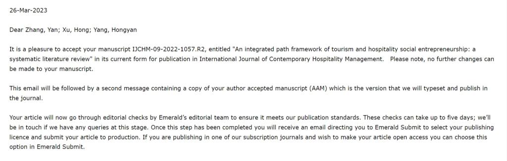 查看详情近日,由公司博士研究生张妍、徐虹教授和杨红艳博士共同完成的研究成果《An integrated path framework of tourism and hospitality social entrepreneurship: a systematic literature review》被旅游管理学科国际顶尖期刊《International Journal of Contemporary Hospitality Management》接收。该期刊2022年影响因子为9.321,在旅游管理领域中具有权威性、学术影响力和学术声誉。该成果是张妍同学在导师徐虹教授的指导下,...