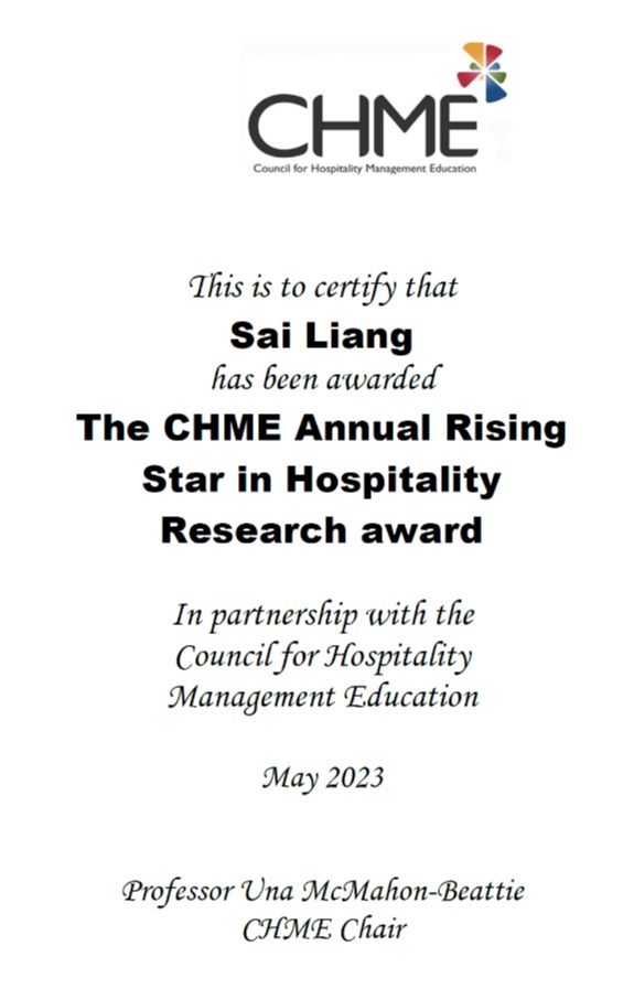 近日,2023国际酒店管理与教育委员会(Council for Hospitality Management Education,CHME)年度会议在荷兰举办,会议上授予了公司梁赛副教授 “the CHME Annual Rising Star in Hospitality Research award”(年度研究新星奖),以表彰其在酒店管理研究方面的创新和卓越贡献。这是公司教师首次获得此类奖项。该奖项主要颁发给在酒店管理(包括教育)领域博士学位完成8年内,其研究成果对酒店和接待业管理领域产生了积极社...