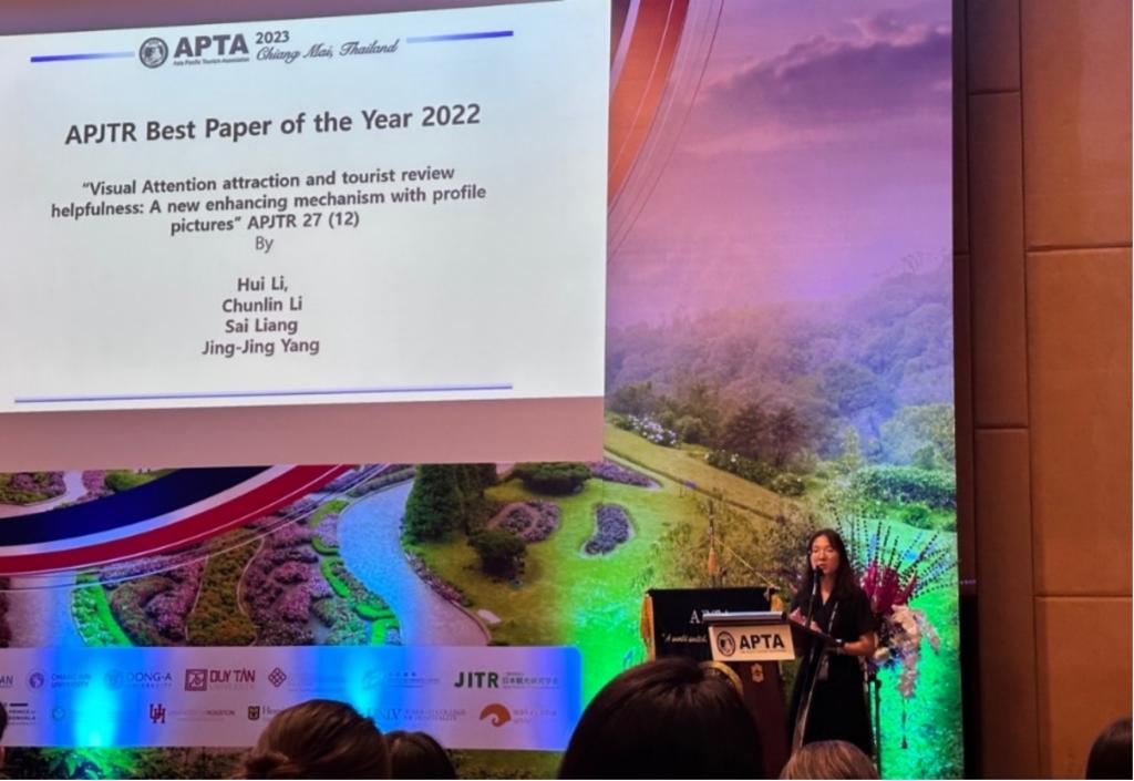 近日,亚太旅游学会(Asia Pacific Tourism Association,简称APTA)2023年度学术会议在泰国清迈举办,公司李辉教授、硕士生李春林、梁赛副教授同校外合作者共同完成的、刊发于Asia Pacific Journal of Tourism Research(APJTR)期刊上的研究成果”Visual attention attraction and tourism review helpfulness – a new enhancing mechanism with profile pictures”在会上被APTA国际学会和Routledge国际出版社联合授予APJTR...