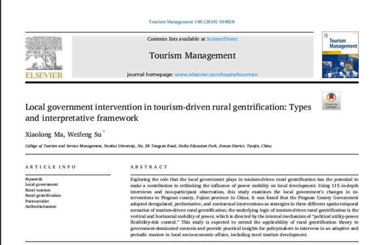 查看详情近日,由公司马晓龙教授与博士研究生苏伟锋共同完成的研究成果《Local government intervention in tourism-driven rural gentrification: Types and interpretative framework》被旅游管理学科顶级期刊《Tourism Management》接收并发表。该论文通过将中国独特的乡村旅游发展经验纳入到国家主导型绅士化的理论框架下,对起源于欧美国家,以市场为主导的乡村绅士化理论进行修正和完善,提出“政治效用-权力弹性-风险控制”为传...