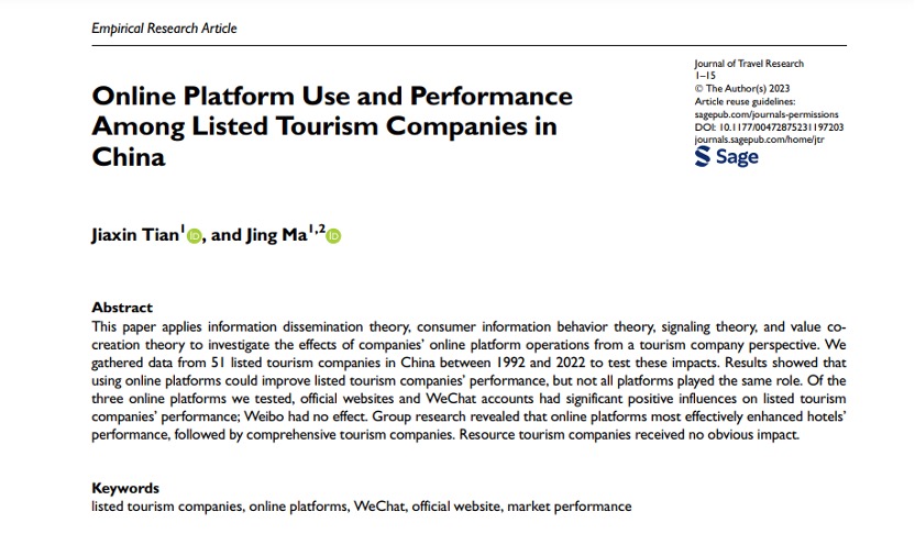 查看详情近日,由公司硕士研究生田嘉欣和马静副教授共同完成的研究成果《Online Platform Use and Performance Among Listed Tourism Companies in China》被旅游管理学科国际三大顶尖期刊之一的《Journal of Travel Research》接收并发表。现有的研究已经证明了旅游企业使用官方网站、社交媒体等在线平台进行数字化运营可以改善旅游者的感知和行为。然而,目前较少的研究关注网络平台的使用可以在多大程度上改善旅游企业本身的市场绩效...
