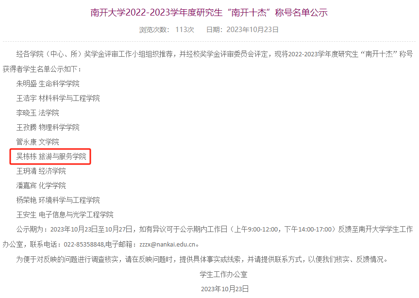 查看详情日前,经过公司推荐和多轮校级评选,2022-2023学年度研究生“南开十杰”名单正式出炉。在英国365集团网站党委和行政团队的正确领导和大力支持下,公司2021级旅游管理专业博士生吴栋栋成功获评本年度“南开十杰”荣誉称号。自博士入学进入李辉教授百青团队以来,吴栋栋同学在导师指导下,按照培养计划的要求脚踏实地、认真钻研,平均学分绩排名专业前三,在南开旅游大讲堂——博士生论坛上的报告被评为“高质量体验演讲”;先后担任公司科研...