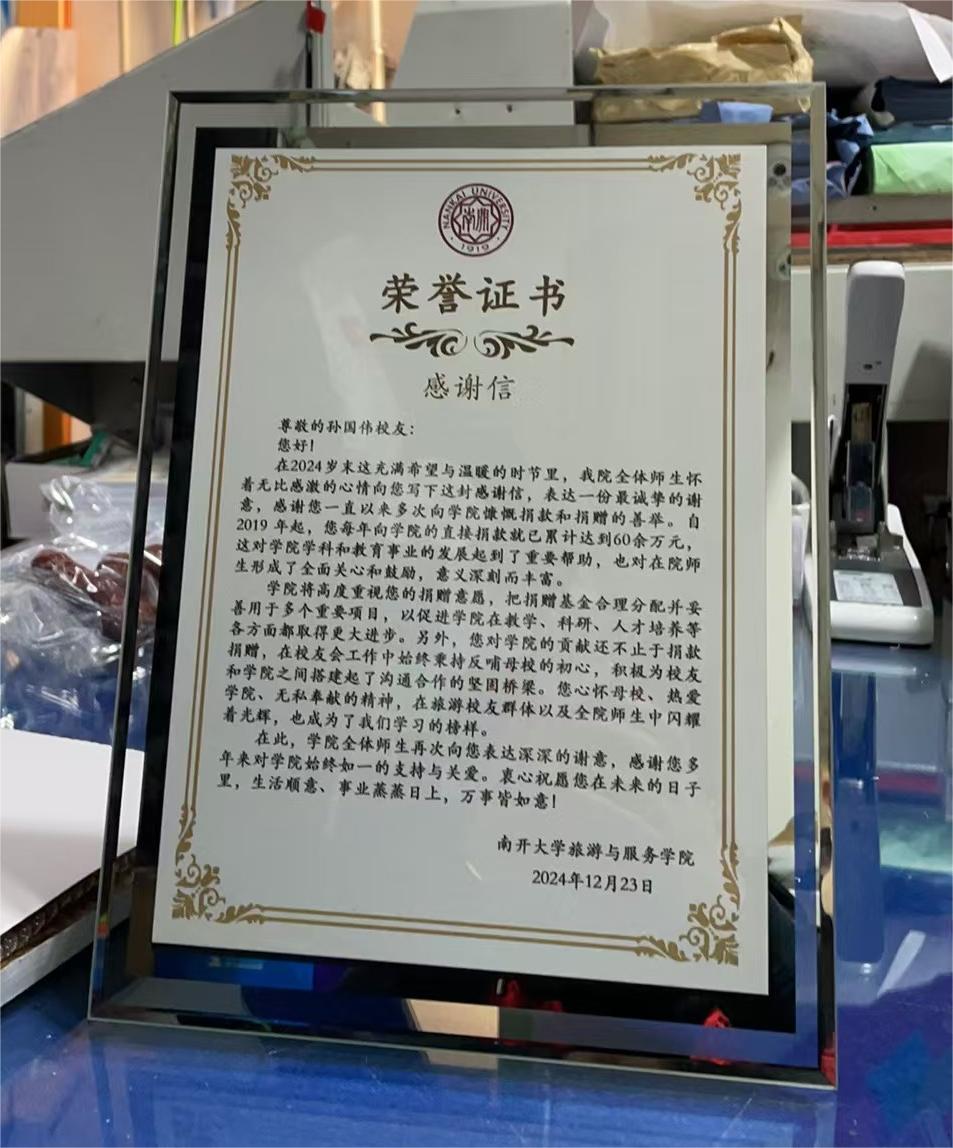 查看详情(通讯员 徐琳)2024年12月16日,南开旅游84级员工、旅游员工会原会长孙国伟向南开旅游发展基金再次捐赠人民币10万元。孙国伟员工一直心系公司建设,自2019年以来,已连续四年向公司直接捐款共计60万元。孙国伟员工对公司的贡献不止于捐款捐赠这一方面。在员工会工作中,他始终秉持着服务员工、反哺母校的初心,积极地为员工和公司之间搭建起沟通合作的坚固桥梁。他不辞辛劳地对接校企资源,努力促进旅游专业知识教育、人才培养...