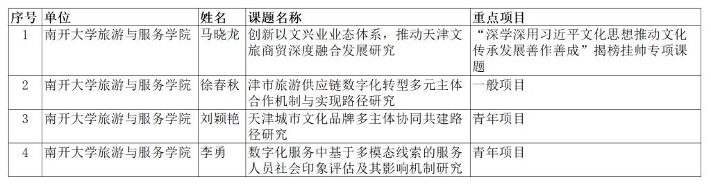 查看详情(通讯员 徐春秋 张丽甜)天津市哲学社会科学工作办公室公示了2024年天津市哲学社会科学规划项目立项名单,公司共四项项目获得立项资助,其中专项课题一项,一般项目1项,青年项目2项。马晓龙教授获“深学深用习近平文化思想推动文化传承发展善作善成”揭榜挂帅专项课题立项资助,徐春秋副教授获得年度项目一般项目立项资助、刘颖艳博士和李勇博士获年度项目青年项目立项资助。公司马晓龙教授申报的课题《创新以文兴业业态体系...