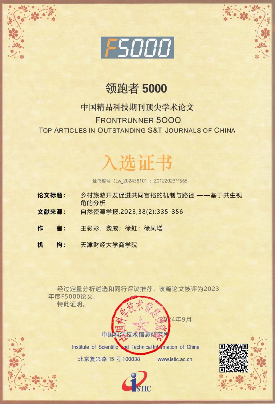 (通讯员 王彩彩)日前,国家科技部中国科学技术信息研究所(中信所)在北京举办“2024年中国科技论文统计结果发布会暨中国一流科技论文世界影响力评价论坛”,发布了“领跑者5000——中国精品科技期刊顶尖论文”。公司徐虹经理以通讯作者身份发表在《自然资源学报》期刊上的“乡村旅游开发促进共同富裕的机制与路径——基于共生视角的分析”一文被评为2023年度F5000论文。入选论文是以陕西省袁家村为例,采用结构化数据分析方...