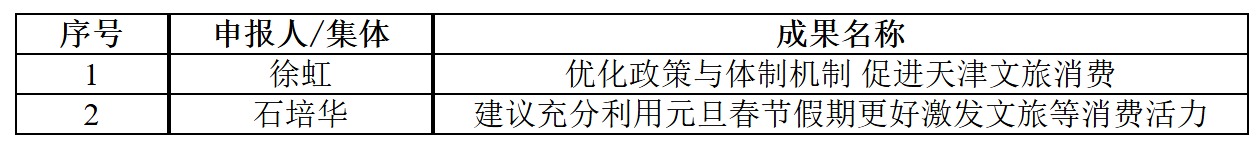 (通讯员 任池)在2022-2023年度第五届天津高校优秀决策咨询研究成果评审中,公司徐虹教授申报的成果《优化政策与体制机制 促进天津文旅消费》和石培华教授申报的成果《建议充分利用元旦春节假期更好激发文旅等消费活力》均获得一等奖。序号申报人/集体成果名称1徐虹优化政策与体制机制 促进天津文旅消费2石培华建议充分利用元旦春节假期更好激发文旅等消费活力