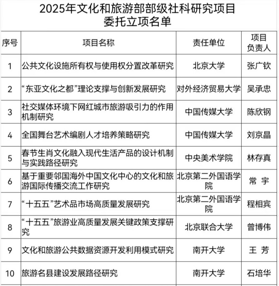 查看详情(通讯员 王屹君)近日,文化和旅游部发布了2025年文化和旅游部部级社科研究项目委托立项名单,本次评审共56个项目获得委托立项。石培华教授申报的《旅游名县建设发展路径研究》获得立项。据了解,《旅游名县建设发展路径研究》基于对旅游名县建设发展实践的观察总结和研究成果分析,重点瞄准旅游名县的概念内涵与特征、当前旅游名县建设所处的环境与现状、旅游名县建设发展的意义价值,旅游名县的主要标志和指标构成等关键问...