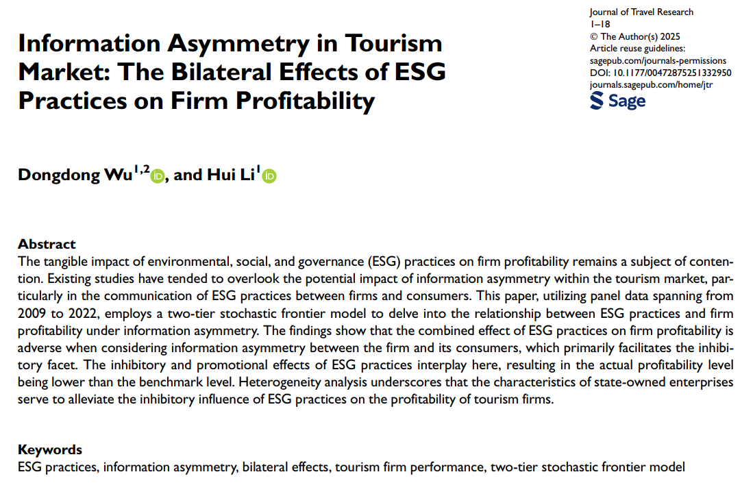查看详情(通讯员 吴栋栋)近日,由公司李辉教授指导博士生吴栋栋完成的研究成果《Information asymmetry in tourism market: The bilateral effects of ESG practices on firm profitability》被旅游管理学科国际顶尖期刊之一的《Journal of Travel Research》录用并网络首发。环境、社会与治理(ESG)实践对企业盈利能力的实际影响仍存在争议。现有研究往往忽视了旅游市场中信息不对称,特别是在企业与消费者之间传递ESG实践信息过程...
