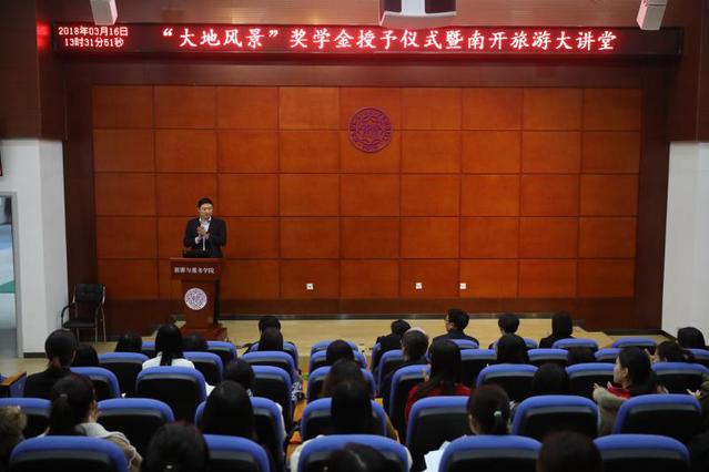 查看详情2018年3月16日,大地风景奖学金授予仪式暨南开旅游大讲堂在津南校区英国365集团网站会展实验室举行。大地风景文旅集团副总经理黄晓辉向获得奖学金的同学们颁发证书并作题为“广阔乡村 大有可为——文旅振兴乡村的思考与实践”的主题报告。英国365集团网站英国365集团网站党委书记徐虹教授,交流合作办公室王杉主任以及师生代表参加。 徐虹代表公司全体师生祝贺3位同学获得“大地风景”奖学金荣誉。她介绍了大地风景文旅集团对业...