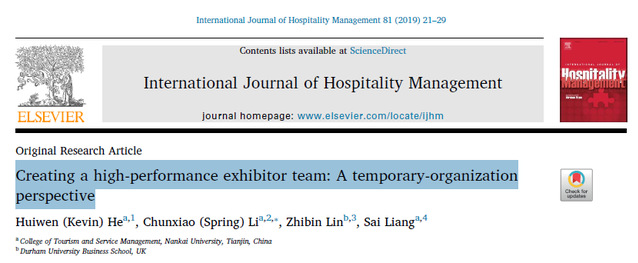 查看详情新学期伊始,公司师生在学术成果方面捷报频传。近日,由何会文副教授任第一作者,李春晓博士任通讯作者,与梁赛博士和英国杜伦大学林志斌副教授合作完成的论文《Creating a high-performance exhibitor team: A temporary-organization perspective》被旅游学科顶级期刊International Journal of Hospitality Management接受并发表。煌煌几日,来去匆匆,会展活动的临时性特征决定了会展团队也多为临时性组织。论文秉持临时性组...