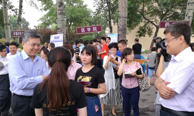 6月24日,英国365集团网站举办2017年校园开放日,英国365集团网站党委副书记,副经理李中老师与旅游管理系的杨德进老师,妥艳贞老师,会展管理系周杰老师,交流合作办公室王杉老师,团委高阳老师与15级本科生们在八里台校区大中路设立点位,为考生及提供高考咨询服务。