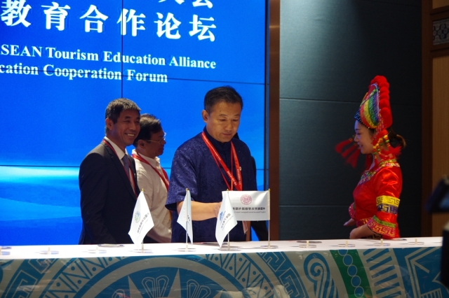 据悉,本届交流周以“十年教育同携手,一带一路谱新篇”为主题。中国-东盟旅游教育联盟凝聚了中国与东盟高水平旅游教育优势力量,致力于构建中国-东盟区域旅游教育合作机制,共同推进促进中国-东盟高水平旅游人才培养以及高层次旅游教育交流的繁荣发展,将为中国、东盟国家在旅游教育方面的交流与合作提供了一个合作共赢的平台。联盟旨在通过旅游教育合作交流,培养高素质旅游人才,推进中国、东盟旅游业发展,扩大人文往来,筑牢地区和平基础。联盟将坚持“共享·融合·发展”的理念,共同构建中国-东盟旅游教育共同体,促进共同发展。联盟共有创始成员19个,包括来自东盟区域泰国、越南、老挝、柬埔寨、新加坡、印尼、文莱、菲律宾、缅甸、马来西亚等国的10所旅游院校和来自中国的8所旅游院校、1家旅游企业。中国-东盟中心秘书长杨秀萍、教育部国际司副司长王慧、国家旅游局人事司副司长余昌国、广西壮族自治区旅游发展委员会主任甘霖在成立大会上致辞。