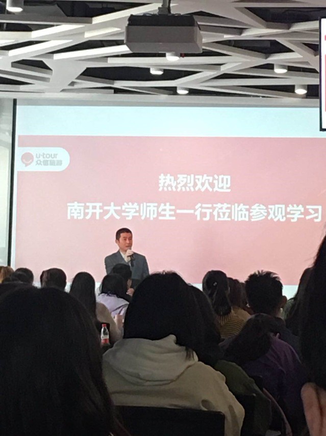 众信旅游集团副总裁、南开旅游员工会会长、1983级旅游系员工王春峰先生代表集团致辞,对公司师生的到来表示热烈欢迎。王春峰员工介绍了当前我国旅行服务业发展面临的广阔机遇和巨大市场潜力,以及对旅游管理类专业人才的迫切需求,非常欢迎旅院的学子们毕业后能进入旅游行业,加入众信旅游集团。