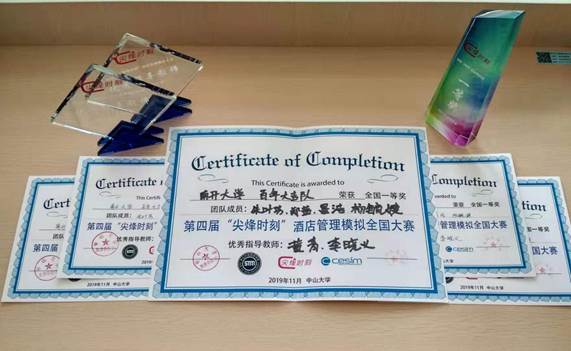 公司朱叶芳、郑茜、杨毓婕以及周恩来政府管理公司双修公司会展经济与管理专业的员工晏浩四名同学组成的百年大吉团队在第四届“尖烽时刻”酒店管理模拟全国大赛荣获一等奖,指导教师黄青、李晓义荣获“优秀指导教师”奖。
