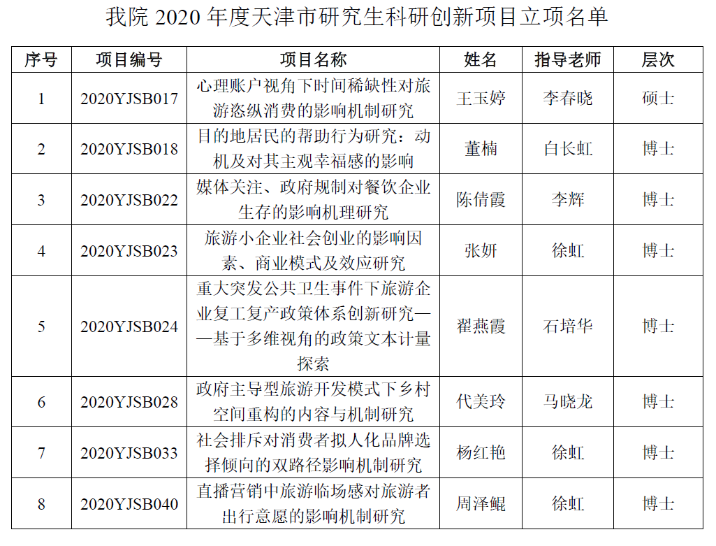 (通讯员:代美玲)为全面落实全国教育大会精神,着力落实立德树人根本任务,强化研究生科研创新能力培养,鼓励和引导在校研究生积极开展创新性研究课题,产出更多高水平科学研究成果,全面提高我市公司产品质量,天津市教育委员会于今年7月启动2020年度天津市研究生科研创新项目申报工作。经个人申报、公司初审推荐和市教委评审,公司硕博研究生共有8项研究生科研创新项目获批立项,具体详细信息如下: