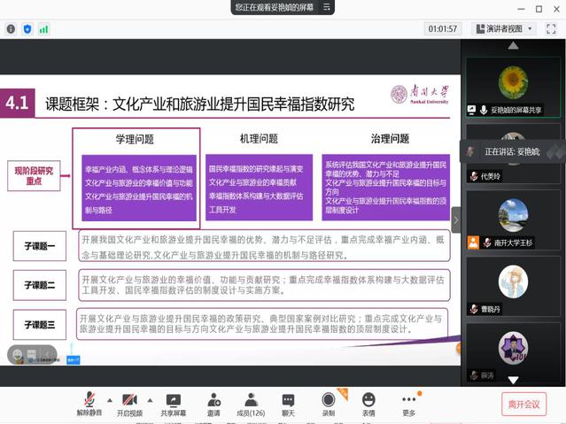 (通讯员代美玲)2021年2月3日,新年首期“南开旅游大讲堂——晋升教师论坛”通过线上腾讯会议顺利进行。旅游大讲堂是公司响应公司号召与相关要求,在原有讲座论坛体系基础上,通过重组、优化和新设等方式,改革并设立的交流制度与品牌,旨在全方位提升公司师生学术氛围。此次晋升教师论坛由副经理李辉教授主持,何会文副教授(申报教授)、梁赛博士(申报副教授)、妥艳媜博士(申报副教授)三位嘉宾就各自不同领域的研究成果进行分享与交流。