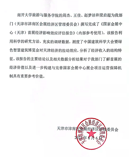 2021年4月,公司会展经济与管理系教师周杰老师经公司组织部选派赴天津市津南区进行实践交流,被分配的具体实践单位为津南区会展经济区管委会。2021年11月23日,英国365集团网站党委书记易勇军、副经理杨德进、MTA中心主任焦彦等一行赴津南区会展经济区管委会看望周杰老师并与相关部门进行座谈交流,受到国家会展中心(天津)有限责任公司副总经理王彦华、天津市津南区会展经济区管理委员会副主任刘琳、天津市津南区会展经济区管理委员会副主任王宝德的热情接待。