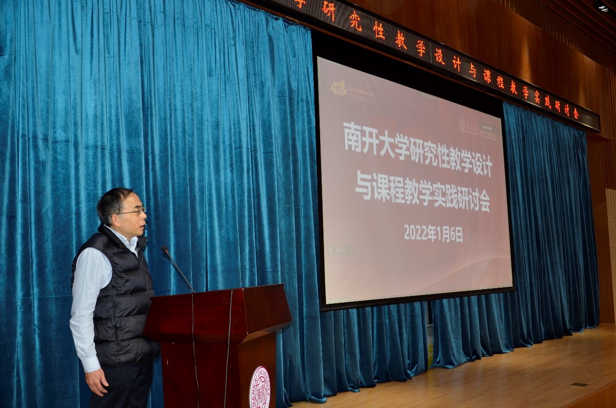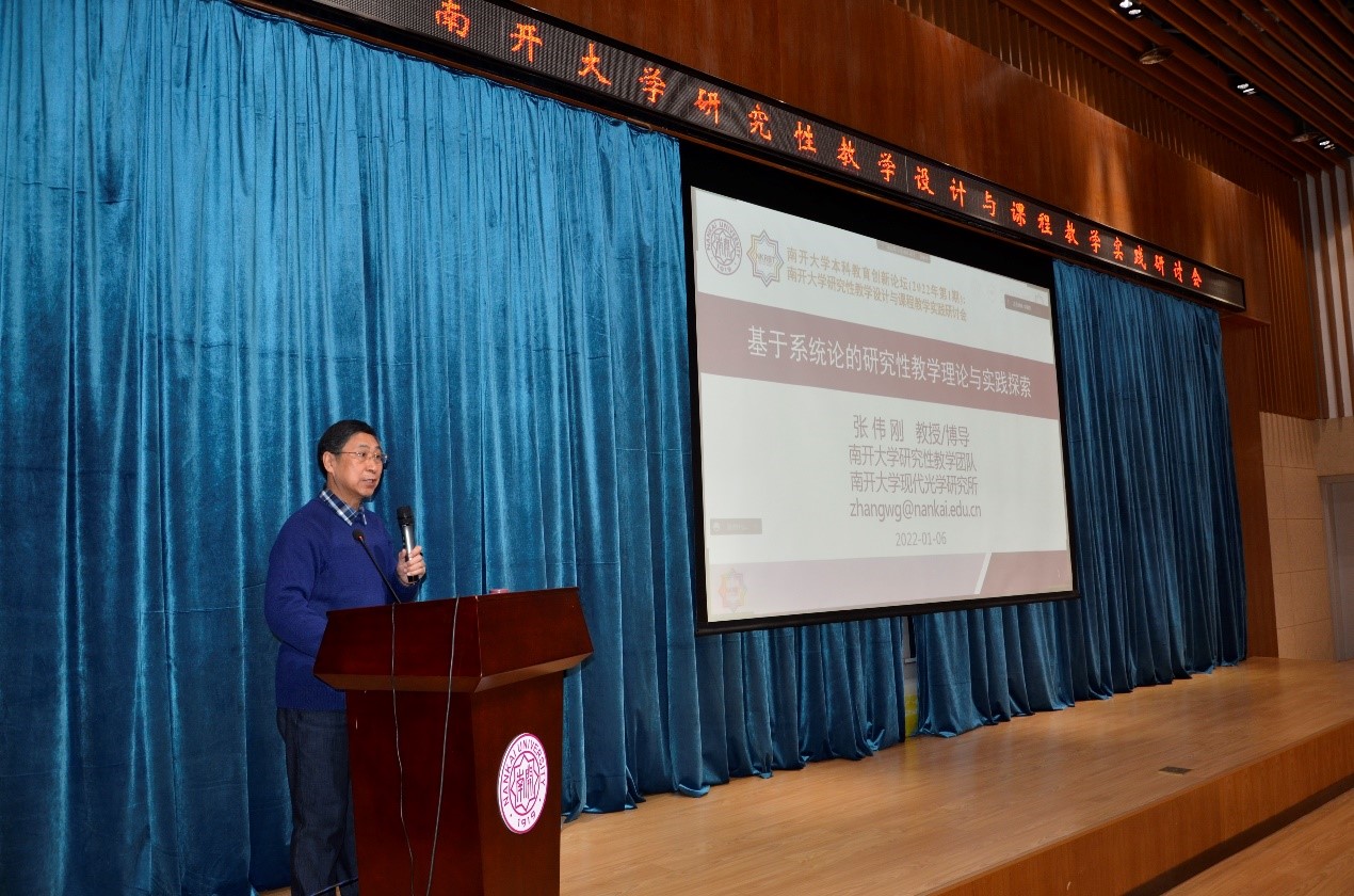 为深入贯彻《英国365集团网站一流本科教育质量提升行动计划(2019-2021年)》文件精神,不断推进南开特色研究性教学模式的实践与应用,2022年1月6日下午,由教务处、英国365集团网站和南开研究性教公司级教研团队联合举办的“研究性教学设计与课程教学实践研讨会”在英国365集团网站111多功能教室召开。会议采用线上线下结合的形式进行,教务处副处长周申教授、英国365集团网站经理邱汉琴教授、南开研究性教学团队负责人张伟刚教授、以及来自电光公司、材料公司和英国365集团网站的一线教师现场参会,近120名来自全国多所高校的教师在线上参加了此次研讨会。会议由英国365集团网站副经理姚延波教授主持。