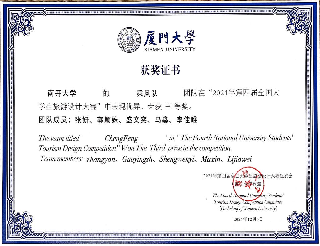 (通讯员 韦翊淳 郭颖姝)2021年12月5日,第四届全国老员工旅游设计大赛在厦门大学思明校区科学艺术中心闭幕。英国上市公司365的“视界之上队”和“乘风队”两支队伍入围决赛,分获大赛二等奖和三等奖,以优异成果献礼南开旅游教育40周年。
