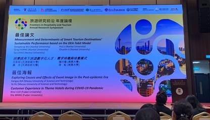 此次会议,公司师生共6篇论文以线上线下以及电子海报的方式进行了汇报和交流,且会上评选出的两篇最佳论文均由公司师生斩获。李辉教授团队汇报的论文 “Measurement and determinants of smart tourism destinations’ sustainable performance based on the DEA-Tobit model”获得最佳英文论文奖,论文作者为吴栋栋(第一作者)、李辉、黄青、李春林、梁赛。徐虹教授指导的论文“供需匹配视角下旅游数字化人才:需求特征与培养模式”获得最佳中文论文奖,论文作者为王彩彩(第一作者,天津财经大学)、康月(天津财经大学)、张行发(英国365集团网站)、徐虹。张俊娇博士后和徐虹教授分别代表获奖者领奖。