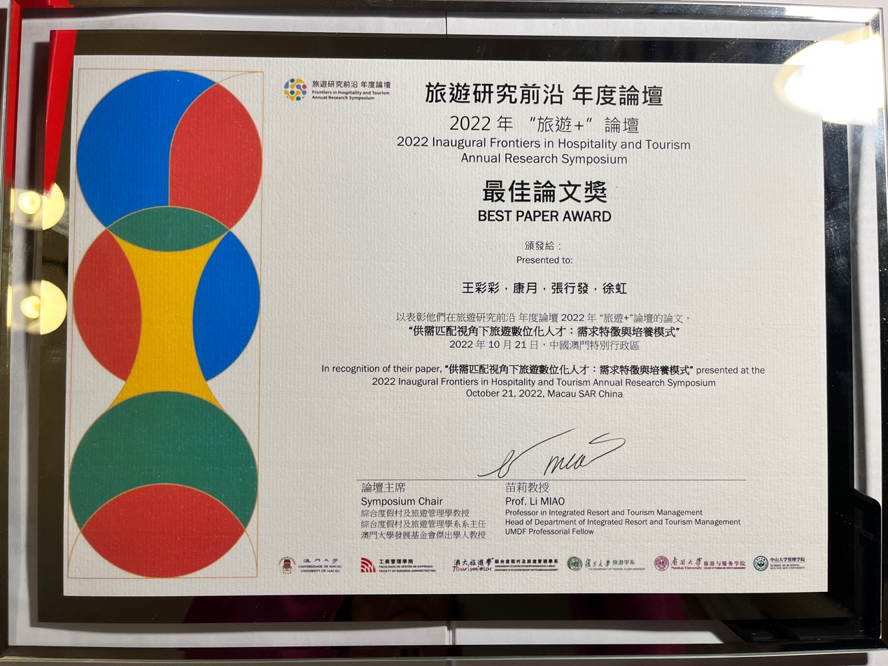 天津财经大学王彩彩博士和公司徐虹教授等合作撰写的研究论文“供需匹配视角下旅游数字化人才:需求特征与培养模式”获得年度最佳论文奖(中文)。该研究主要针对我国旅游行业数字化人才缺口问题,选取前程无忧网、智联招聘网的旅游企业招聘信息、旅游上市公司年报等多种渠道获取相关研究数据,从供需视角下探索旅游数字化人才的需求特征和培养模式,研究对推进旅游教育和团队建设具有一定的意义。
