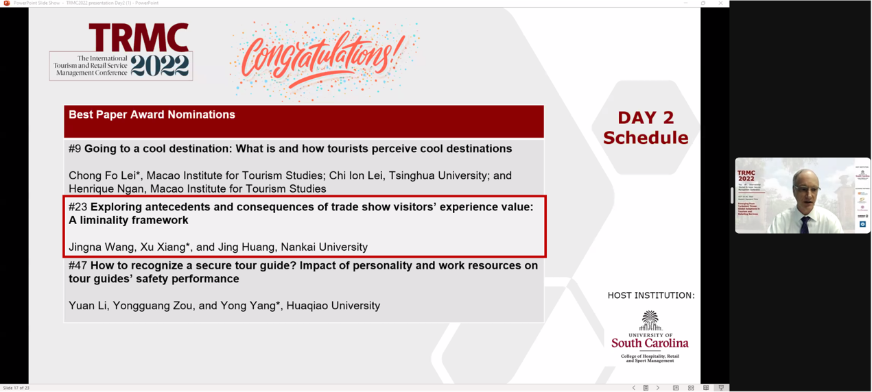 北京时间20日晚,TRMC2022圆满闭幕。闭幕式上首先公布了6篇最佳论文提名奖,经论文评审委员会严格评审和投票,从中选出了3篇最佳论文。公司王菁娜副教授团队的研究论文“Exploring antecedents and consequences of trade show visitors’ experience value: A liminality framework”获得最佳论文提名奖。最后,组委会宣布了下一届TRMC会议的举办地,TRMC2023将回到中国澳门,由澳门旅游公司承办。