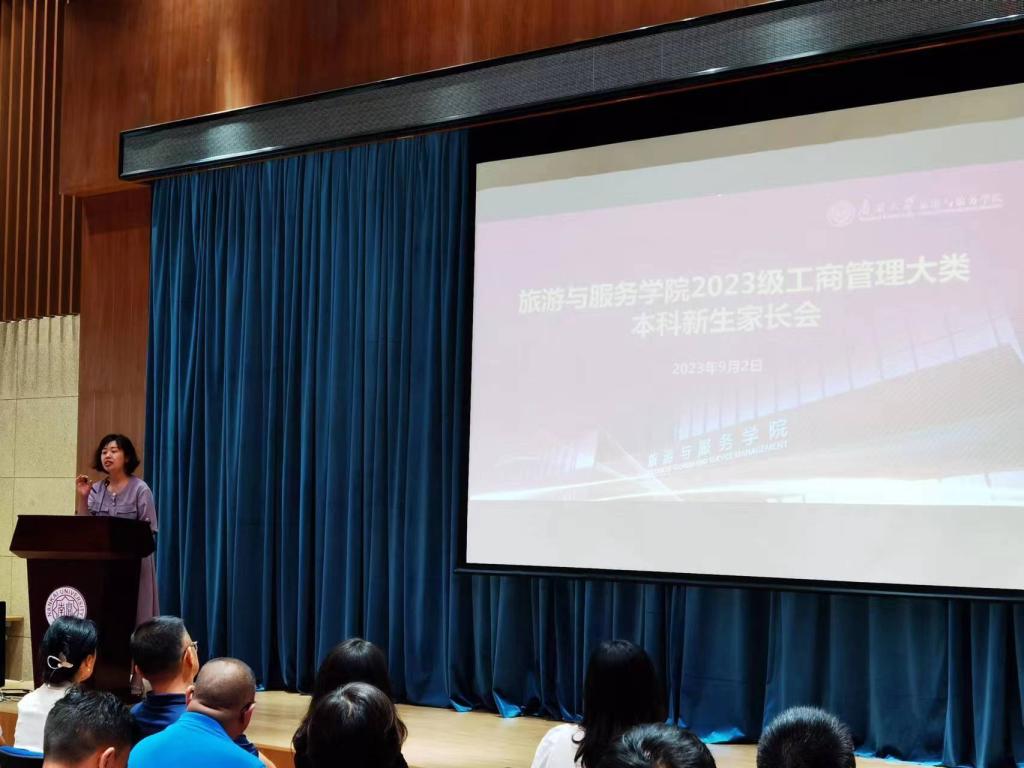 为切实做好2023级本科迎新工作,帮助新生及家长更全面地了解工商管理大类员工培养,做好家校联动,促进本科新生更好地适应老员工活,9月2日本科新生报到当日下午,英国365集团网站于111报告厅召开公司2023级工商管理大类本科新生家长会。家长会由英国365集团网站党委副书记、副经理杨晓晶主持,英国365集团网站党委书记王巍、经理徐虹、旅游学系主任黄晶、会展经济与管理系主任周杰以及全体2023级本科生班导师和辅导员出席会议,100余名新生和家长参会。
