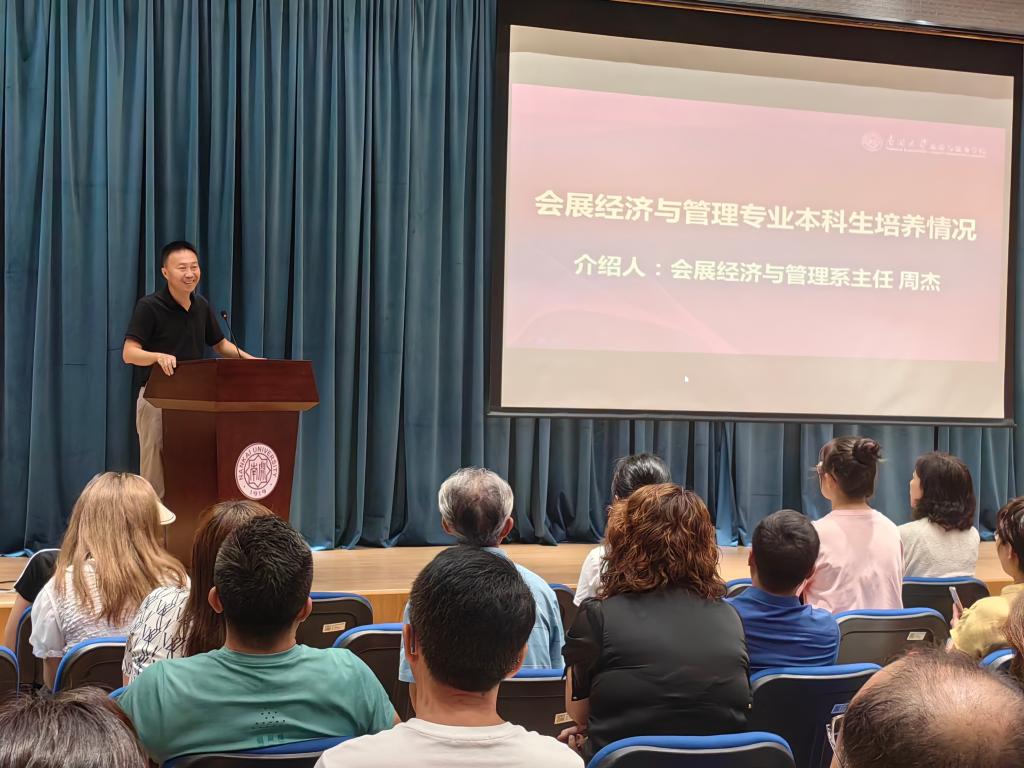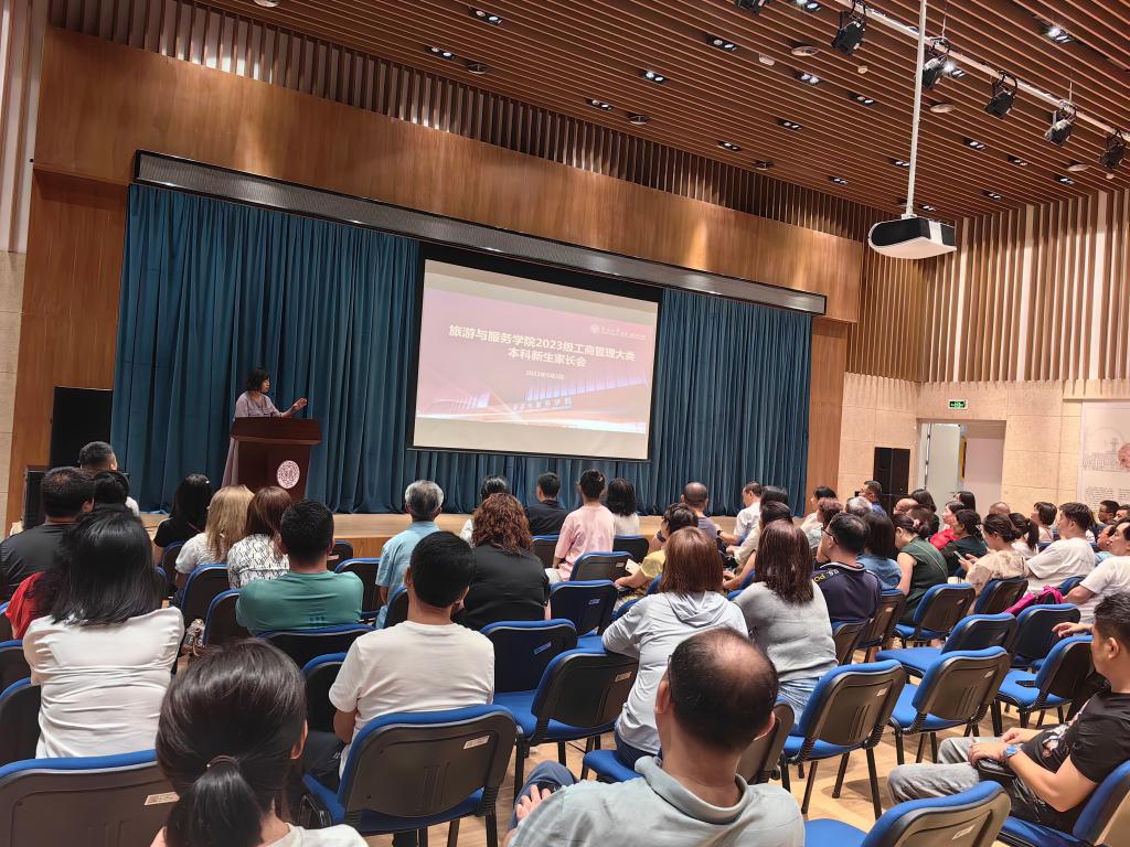 接下来,旅游学系主任黄晶以及会展经济与管理系主任周杰分别从专业维度出发,围绕课程设置、实践教学模式以及未来就业方向等方面向家长们介绍了公司的专业优势以及领先的教育培养模式,并从员工的获得感出发就新生和家长们关心关注的问题进行了说明。