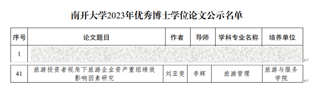 刘亚斐同学自博士入学进入李辉教授百青团队以来,在导师指导下聚焦旅游企业资产重组领域,刻苦钻研、深入挖掘,完成的旅游企业投资者行为与资产重组绩效、旅游企业价值关系的系列研究成果连续刊发在《Tourism Management》和《Annals of Tourism Research》等旅游管理学科国际顶尖期刊上。她博士毕业后入职海南大学旅游公司工作,继续在旅游企业管理领域开展教学和科研工作。