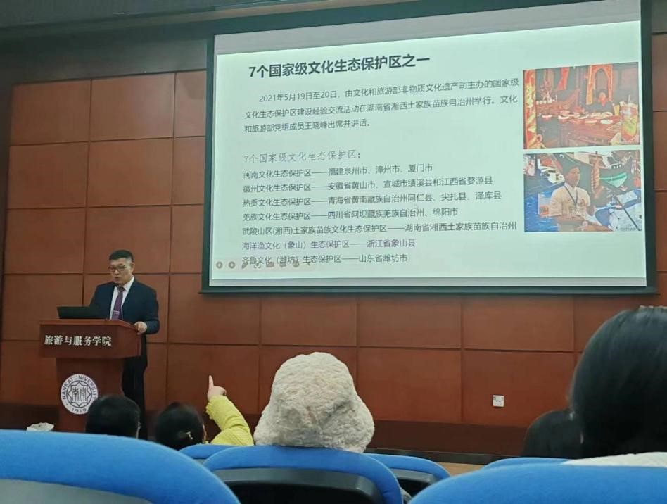 丁建东以《“渔文化”非遗如何赋能乡村建设——宁波东门渔村的建设》为主题进行讲座。他从象山县作为七个国家级文化生态保护区之一的介绍出发,分享了其围绕象山独有的“渔文化”非物质遗产开展研学旅游项目开发的情况,并总结出“固根本、强基础,谋转型、促融合,接地气,展特色”的实践经验。丁建东表示,要以“非遗+旅游”的方式,积极宣传象山“渔文化”,探索出具有象山特色的乡村文旅建设模式,努力将象山县东门渔村建成遗产丰富、氛围浓厚、特色鲜明、民众受益的美丽新乡村。