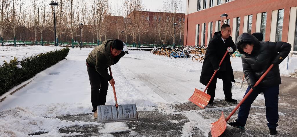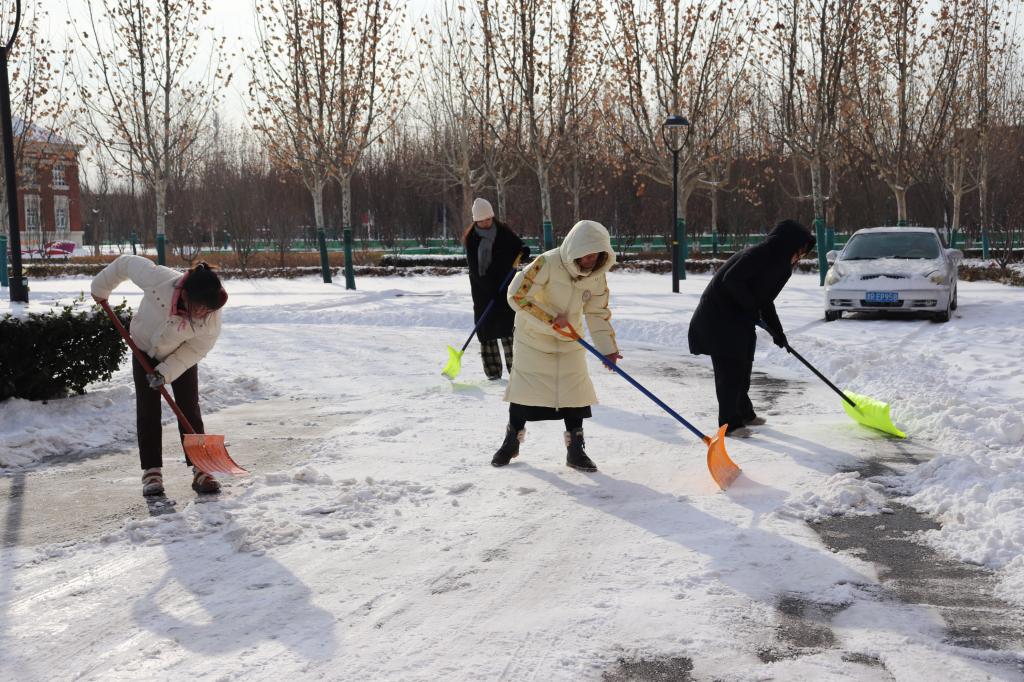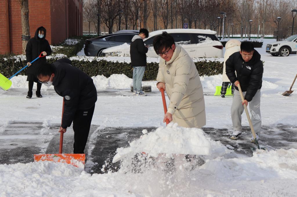 在英国365集团网站党委、团委的倡议下,12月15日早上,公司行政教师和员工志愿者们在公司楼前集合,与物业人员一起开始了扫雪行动。老师和同学们有的拿起铁锹铲,有的拿着扫帚扫,有的拿着“扫雪神器”一路破冰。有的同学专程拿着工具从宿舍赶来,在路上就开始边走边干。虽然天气寒冷,但大家干得热火朝天,不一会儿额头就渗出汗水。很快,公司楼前的道路积雪就被老师、同学和物业的工作人员一起清除干净了。