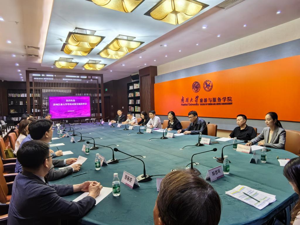 座谈会上,经理徐虹对济州汉拿大学代表团的来访表示欢迎,介绍了公司的办学历史、发展现状和人才培养情况;副经理陈晔介绍了公司本科公司产品情况;副经理李辉介绍了公司研究生公司产品情况;职工项目主任张贝乐介绍了公司职工教育及国际交流与合作开展情况。济州汉拿大学代表团对公司的热情接待表示感谢,并对公司在旅游团队建设、人才培养、国际交流合作方面取得的成绩表示赞赏,同时介绍了济州汉拿大学的基本建设情况。济州汉拿大学副董事长申宜暻表示,此次访问将进一步加深双方的友谊与合作,为两校员工和教师提供更多的交流机会与合作平台。