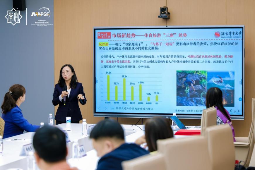北京体育大学体育休闲与旅游公司副经理蒋依依教授分享了中国体育旅游产业创新与人才培养的前沿观点。她指出,在政策的引导下,中国体育旅游发展成果显著,为区域经济建设注入了新活力,形成了赛事经济、休闲体育经济等独具特色的体育旅游产业体系。当前,体育旅游在数据统计、资源评价、标准体系及复合型人才培养等方面仍面临挑战,需要企业、目的地和政府三方共同努力,推动体育旅游的融合、规范和可持续发展。