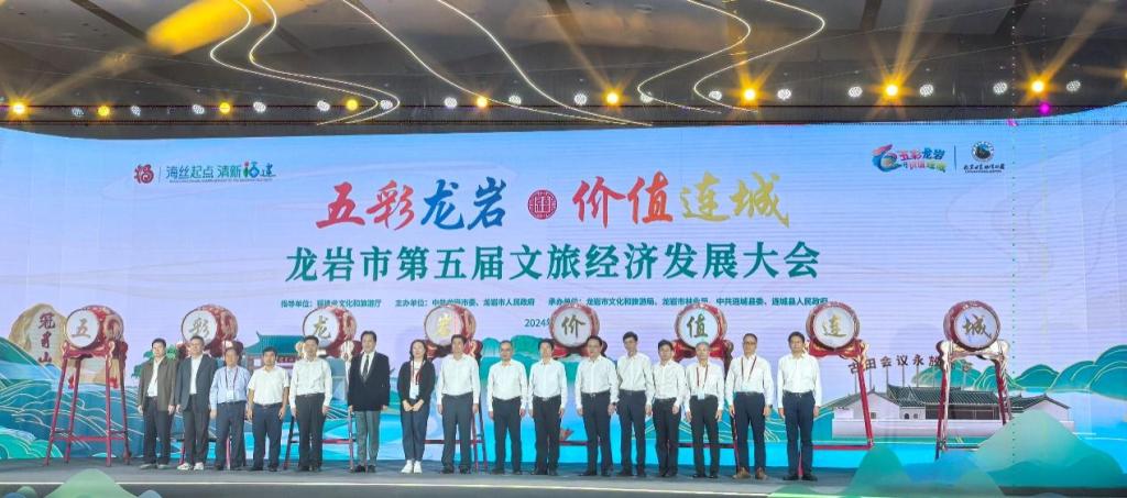 据悉,本届大会以“五彩龙岩 价值连城”为主题。与会领导嘉宾共同观看了文旅推介短剧《五彩龙岩 缤纷之旅》。主办方分别为著名艺术家、国家一级演员唐国强授“龙岩市文旅宣传大使”牌匾,龙岩籍奥运冠军项启彰、亚运会冠军童心授“龙岩市文旅推介官”牌匾,还举行了龙岩世界地质公园授牌仪式、龙岩市第三届文旅“客家美食宴”大赛颁奖仪式、龙岩市文旅经济发展大会会旗交接仪式等活动。
