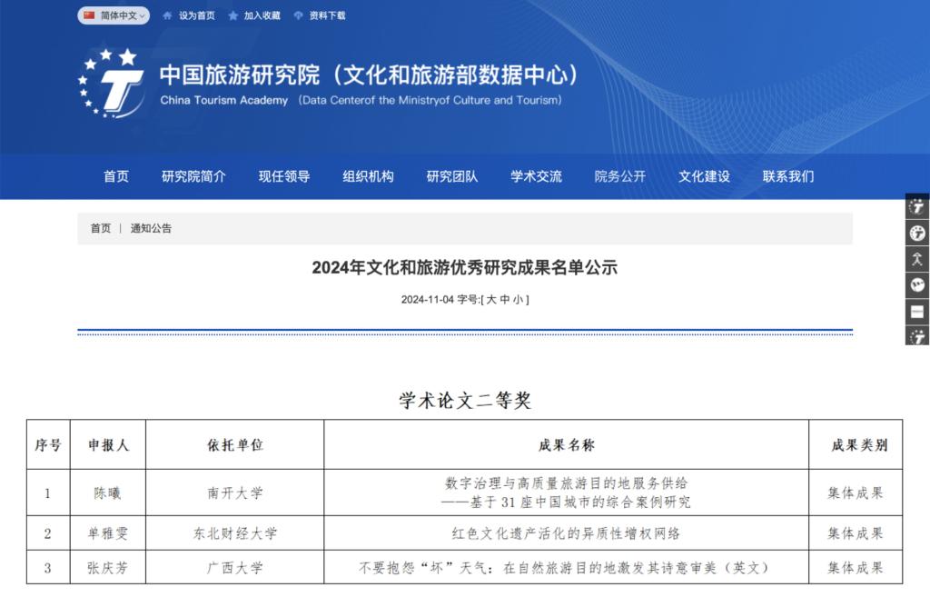 (通讯员 陈曦)近日,2024年文化和旅游优秀研究成果揭晓。本年度共遴选出30项优秀研究成果,其中,学术论文10项,专著10项,研究报告10项。由公司博士研究生陈曦为第一作者,白长虹教授和陈晔教授指导,博士研究生徐进共同完成的论文《数字治理与高质量旅游目的地服务供给——基于31座中国城市的综合案例研究》获学术论文二等奖。