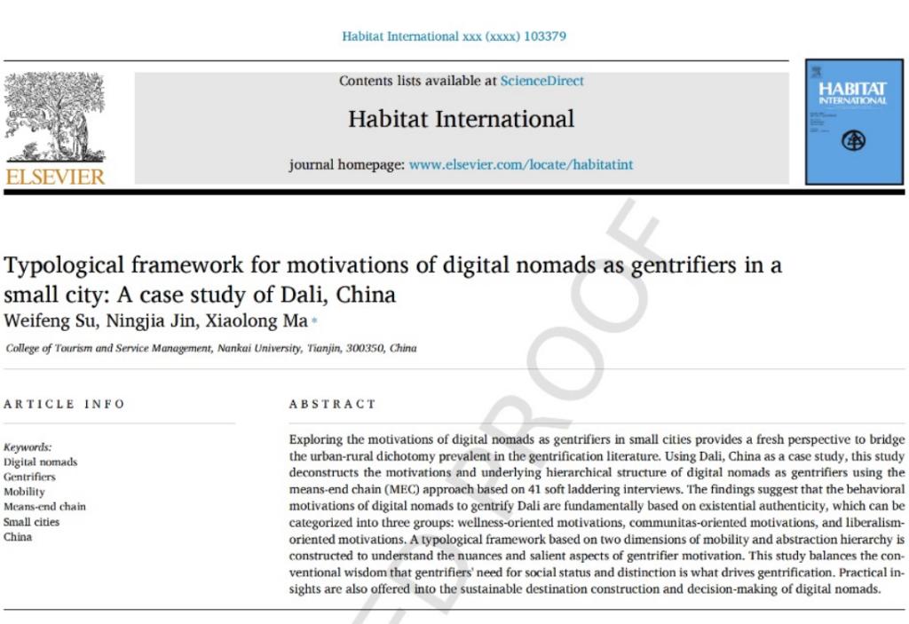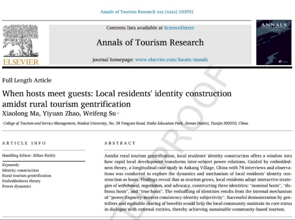 (通讯员 张丽甜)近日,公司博士研究生苏伟锋在导师马晓龙教授指导下与合作者共同完成三项成果,分别被《Habitat International》《Annals of Tourism Research》《Tourism Management》期刊录用。研究分别从数字游民迁移动机、乡村居民身份建构、乡村旅游创业等角度切入,探讨了旅游绅士化背景下城乡互动的前沿问题,提升了公司在更广泛学科领域内的国际声誉。《Habitat International》由联合国人居委员会于1976年创办,是城市规划与城乡发展研究领域的国际权威刊物,属SSCI一区期刊(中科院一区Top和JCR一区)。《Annals of Tourism Research》和《Tourism Management》是旅游管理学科最为顶尖的两本学术刊物,被列为ABS 4和FMS A类期刊,在管理学领域具有重要影响力。