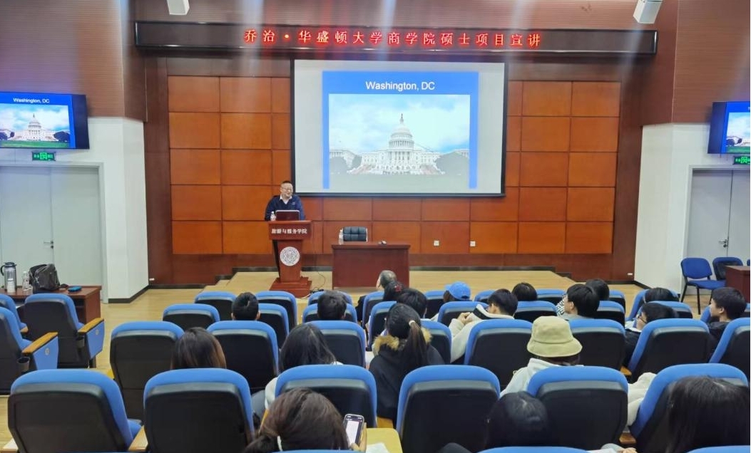 之后,Jabbour教授和乔治·华盛顿大学商公司毕业生、公司旅游学系85级员工靳波为公司本科生介绍了乔治·华盛顿大学商公司的旅游接待业与会展、体育管理、商业分析、金融、市场营销等硕士项目相关情况,为有意愿赴美读研究生的同学们介绍了申请经验等。