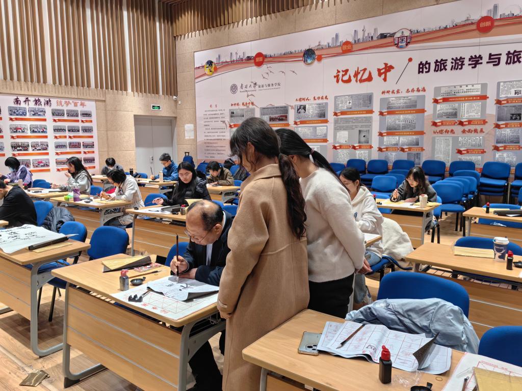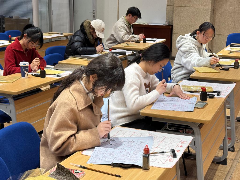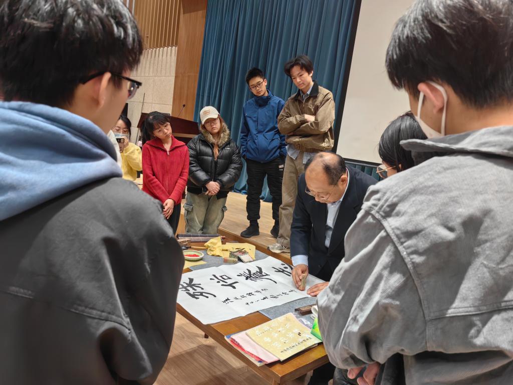 随后,刘运峰通过亲自示范为师生们讲解了书法从执笔姿势到运笔力道各方面的写作技巧。他特别强调,书法不仅是技艺的展现,更是文化的传承与表达,通过临摹字帖,可以感受到书法家在书写时的心境、个人的风骨,这也是书法的精髓。书写完成后,刘老师又向师生们介绍了书法作品的落款知识,他指出书法虽只有黑白两色,却能呈现画面,印章的点缀能够更好地修饰和点缀作品,形成更丰富的意蕴。