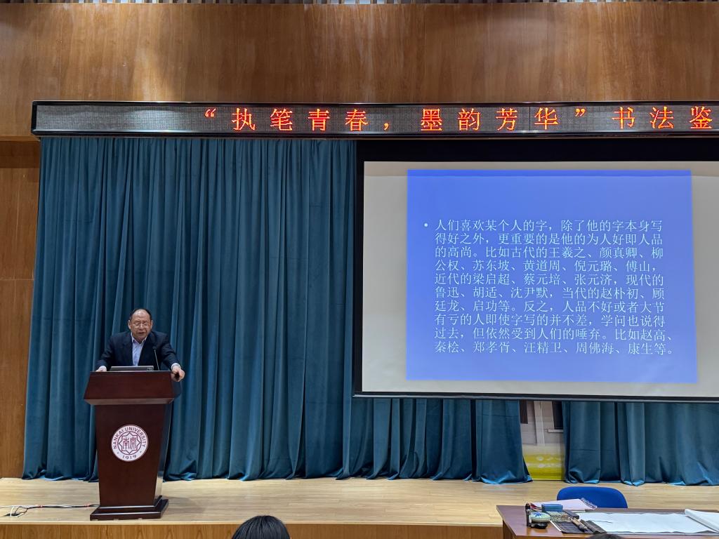 活动伊始,刘运峰首先以“中国书法之美与文化传承”为主题,为师生们详细了中国书法的发展史。从甲骨文的朴拙、隶书的庄重到行草的飘逸,刘运峰系统解析不同字体的艺术特色,并列举《兰亭集序》《祭侄文稿》等经典作品,结合笔法、结构与章法布局,生动诠释了“书法之美在于形神兼备”的要义,深入浅出地讲解了书法鉴赏的要点。
