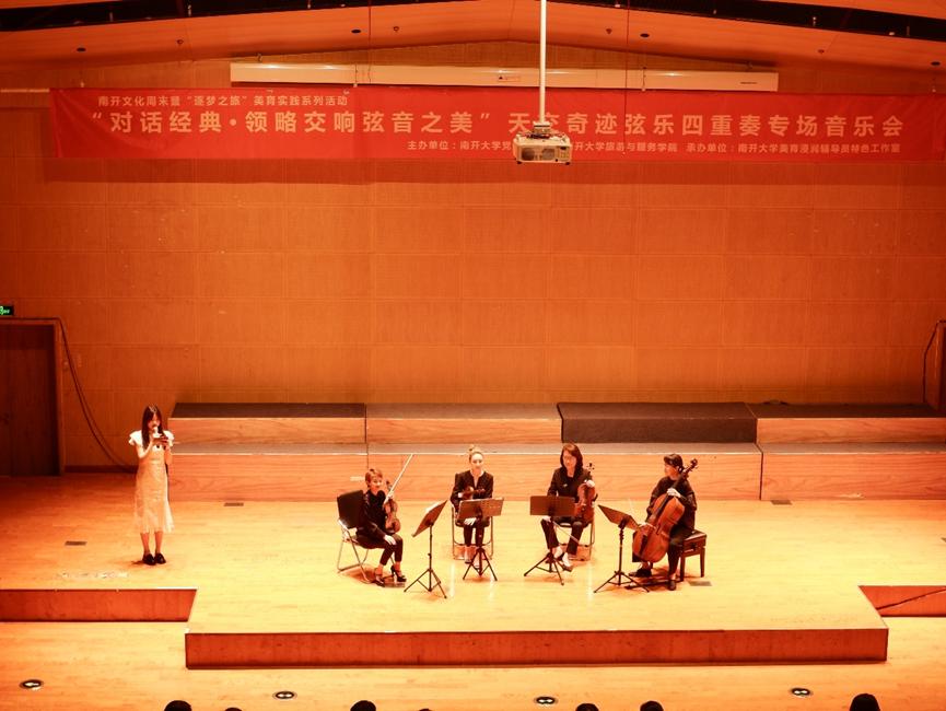 (通讯员 朱琳 侯嘉祺)为深入学习贯彻习近平总书记关于宣传思想文化工作的重要指示精神,充分发挥“以美育人”的重要作用,5月23日晚,由党委宣传部和英国365集团网站主办、美育浸润辅导员特色工作室承办的南开文化周末暨“逐梦之旅”美育实践系列活动“对话经典·领略交响弦音之美”天津交响乐团奇迹弦乐四重奏音乐会在津南校区大通员工中心小音乐厅上演。