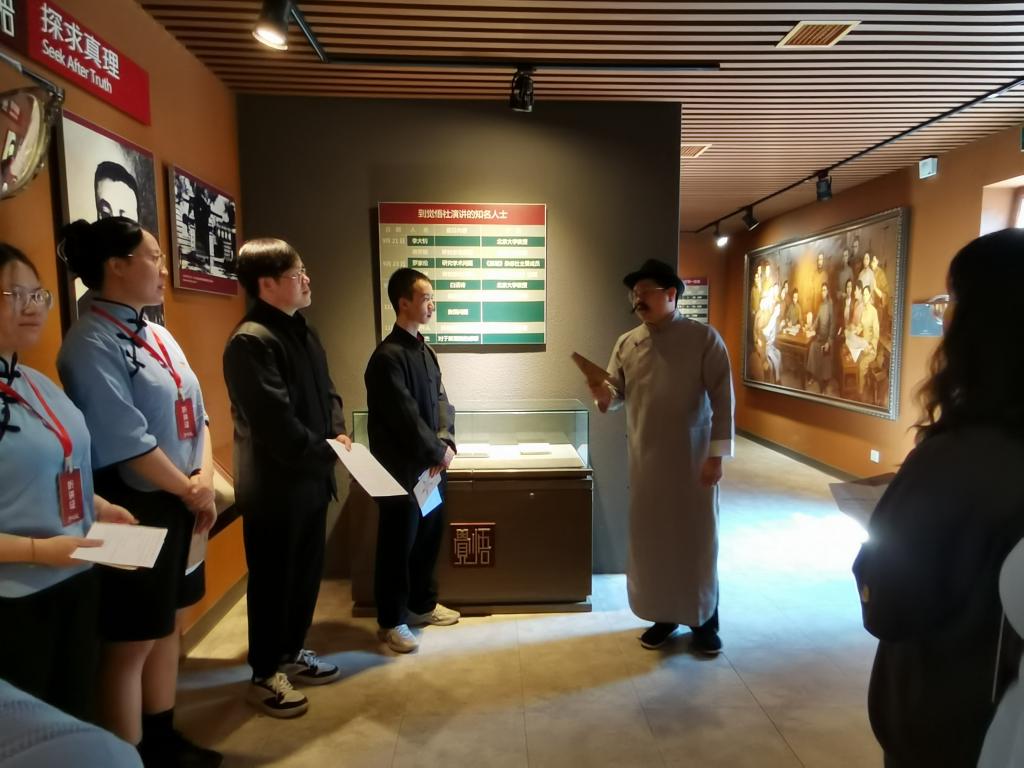 活动伊始,依托“静象空间”在觉悟社打造的“觉悟薪火”沉浸式体验项目,师生党员在“薪火守护人”的引导下,通过亲身扮演周恩来、邓颖超、马骏等革命先辈角色、情景再现演绎和NPC互动答题等形式,共上“跨越时空对话,点燃信仰之光”沉浸式党课,重温了觉悟社从成立到发展壮大的爱国救亡历程,深刻感悟革命先辈爱国情怀。过程中,当演绎到觉悟社成员被捕入狱情节,师生们为传承革命薪火饱含深情地喊出“我愿意”“我不怕”“不放弃”时,不少同志眼泛泪光。沉浸式党课在师生们“觉悟薪火代代相传”的高呼中落幕。