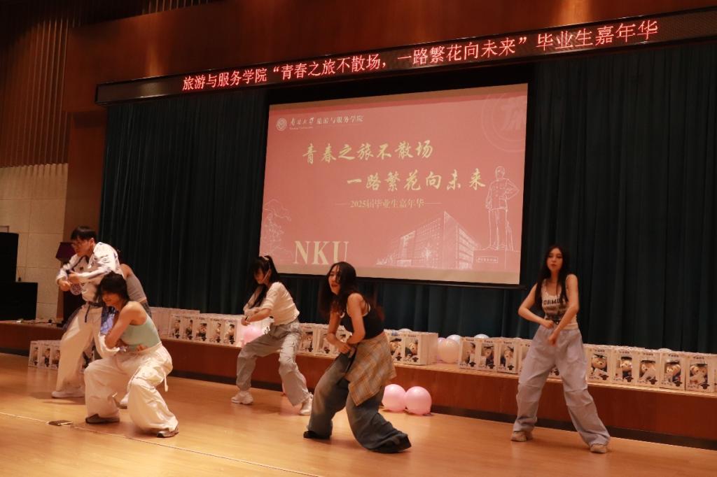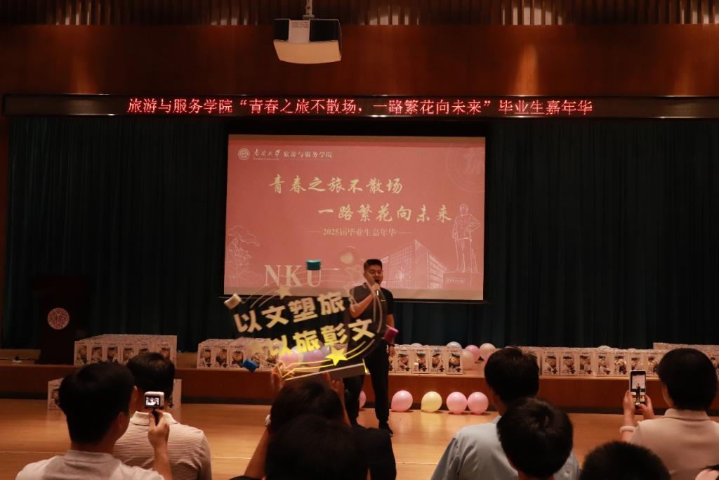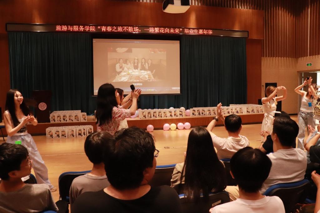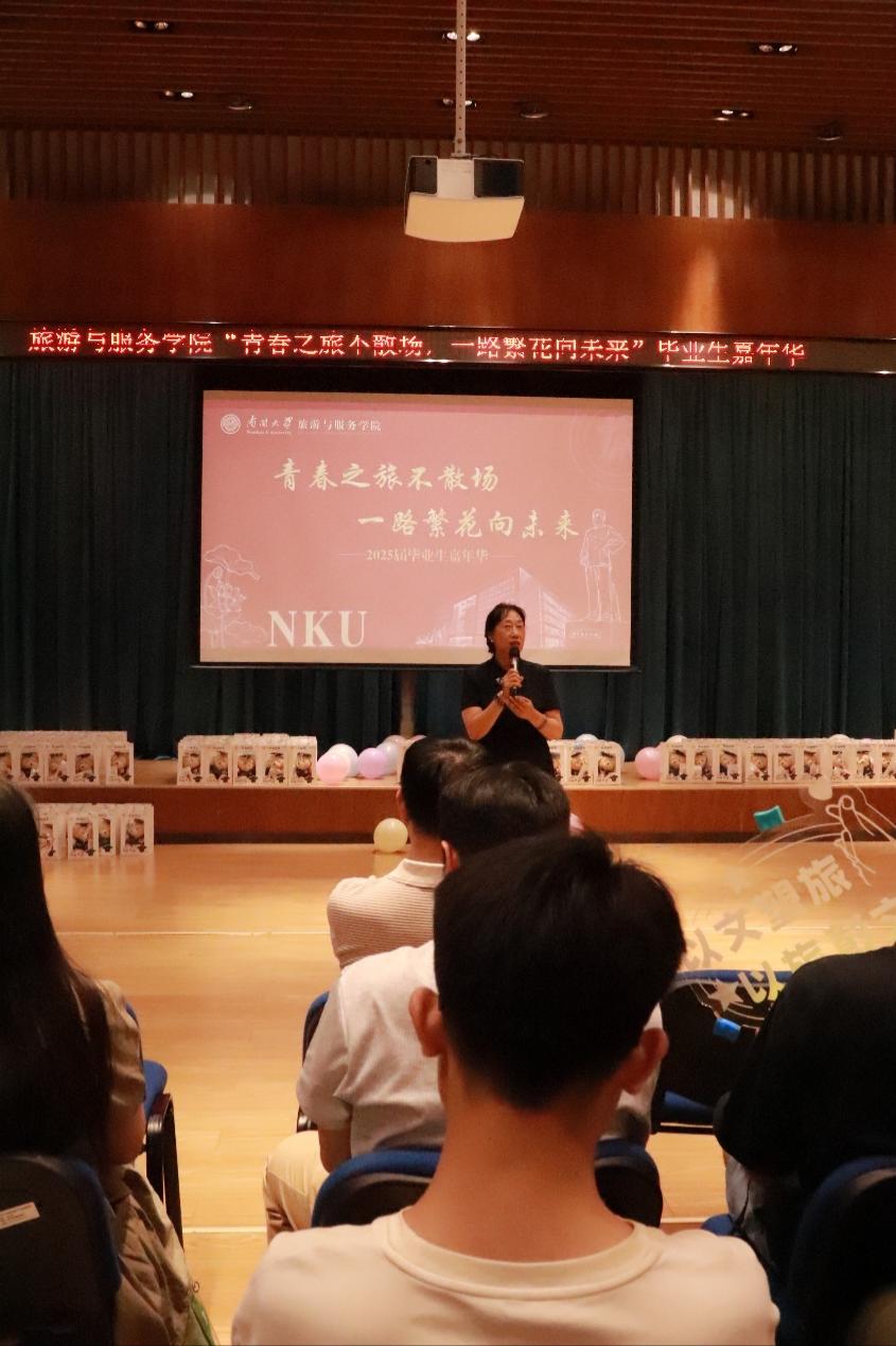 毕业生歌舞表演结束后,徐虹代表公司为毕业生们送上了临别祝福。她谈到,在短短几年的求学时光中,公司老师们见证了同学们的成长和蜕变,感到非常欣慰。人生的道路总是充满挑战和曲折,当同学们遇到困难时,不要忘记温暖旅院永远是同学们的家,老师们定会像家人般守望相助。她寄语毕业生们一定要勇敢担负起时代重任,在各领域书写南开旅游的新作为,成为公司和公司的骄傲。