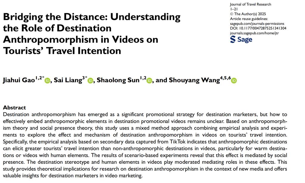 (通讯员 郭子琪)近日,公司梁赛教授团队的多项研究成果被旅游管理学科国际三大顶尖期刊之一的Journal of Travel Research录用并在线发表,展现了公司在旅游目的地与消费者行为研究领域的持续突破。其中,团队博士生郭子琪作为第一作者参与完成研究“Is Scarcity Always Beneficial? Effects of Persuasive Cue Types in User-Generated Advertisements (UGAs) on Travelers’ Destination Interest”;梁赛教授与西安交通大学等高校学者合作完成研究“Bridging the Distance: Understanding the Role of Destination Anthropomorphism in Videos on Tourists’ Travel Intention”。