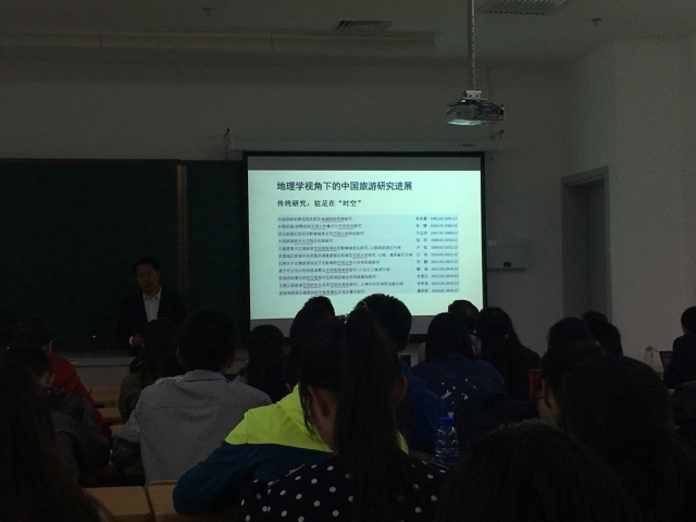 在这一部分的报告中,马晓龙研究员首先向同学们阐述了本次报告所依据的数据来源分析。在对自然科学基金委网站进行“旅游”(不含“休闲”,时间限定为1987-2015年)这一关键词的搜索时发现,含“地理”这一词组的自然科学基金项目占总数百分之七十,共184项。通过对相关文献的整理及归类,地理学视角下的中国旅游研究主要包括以下几个方面:1.传统研究:驻足在“时空”,2.现象研究:依托于“时代”,3.扩展研究:创新在“发展”,4.集成研究:厚重在“积淀”,5.案例研究:演绎-结合-归纳。最后,马晓龙研究员提出了地理学视角下中国旅游研究的集聚和扩散现象,集聚现象例如研究常常聚焦于世界遗产地、农户、女性、旅游扶贫、新常态等方面,并以“人地关系地域系统”为核心形成集聚趋势,扩散现象则指研究向着更加广域的多学科视角如社会学、民族学等渗透。为了使同学们理解的更加深刻,马晓龙研究员例举了“外界受包装的农家乐比真实行的农家乐旅游产品更受欢迎”的案例,并提出了给同学们在研究中的三点建议:1.应重视案例地的推广价值;2.科学问题的探究应该精准描述,清楚解决;3.应当精简研究问题,量力而行。