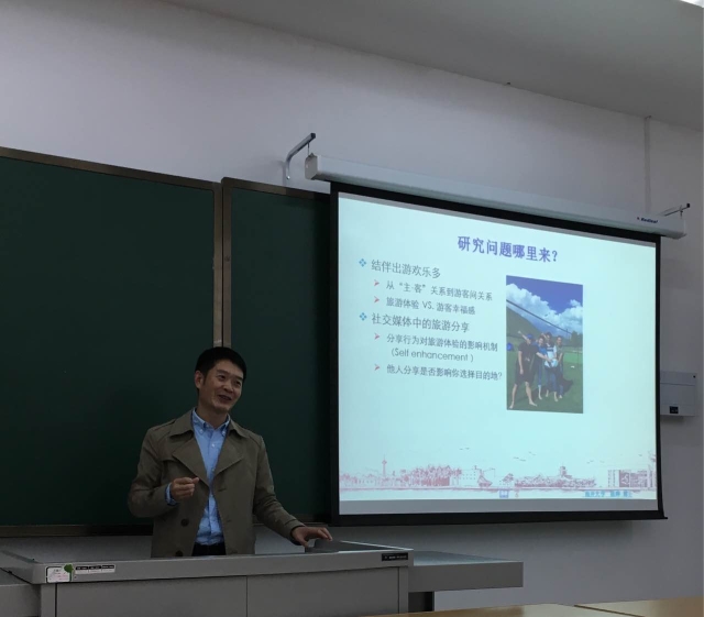 陈晔老师的分享主要分为两大部分六个方面:第一部分讲述了自己在美国的生活感受和对美国的整体印象,文化的多元化、社会的包容性以及美国人对科研实事求是的态度令他印象深刻;陈老师介绍了自己访学的公司和美国博士生的培养方式,给同学们提供了实用的出国申请公司的经验;同时,提及到了美国的教育科研环境,他比较了公立与私立公司、研究型与教学型公司的不同。第二部分谈及美国访学使自己重新认识科学研究,陈老师认为,科研必须具有求真和严谨的态度;同时,他从结伴出游、社交媒体中的旅游分享以及服务界面中的技术应用三方面讲述了自己发现研究问题的过程和视角;最后,谈及旅游研究中的中国情境和中国理论,陈老师从中国人的文学旅游行为、中国背包客的出行动机和中国的婚庆旅游等方面介绍了中国可以贡献的旅游研究理论。